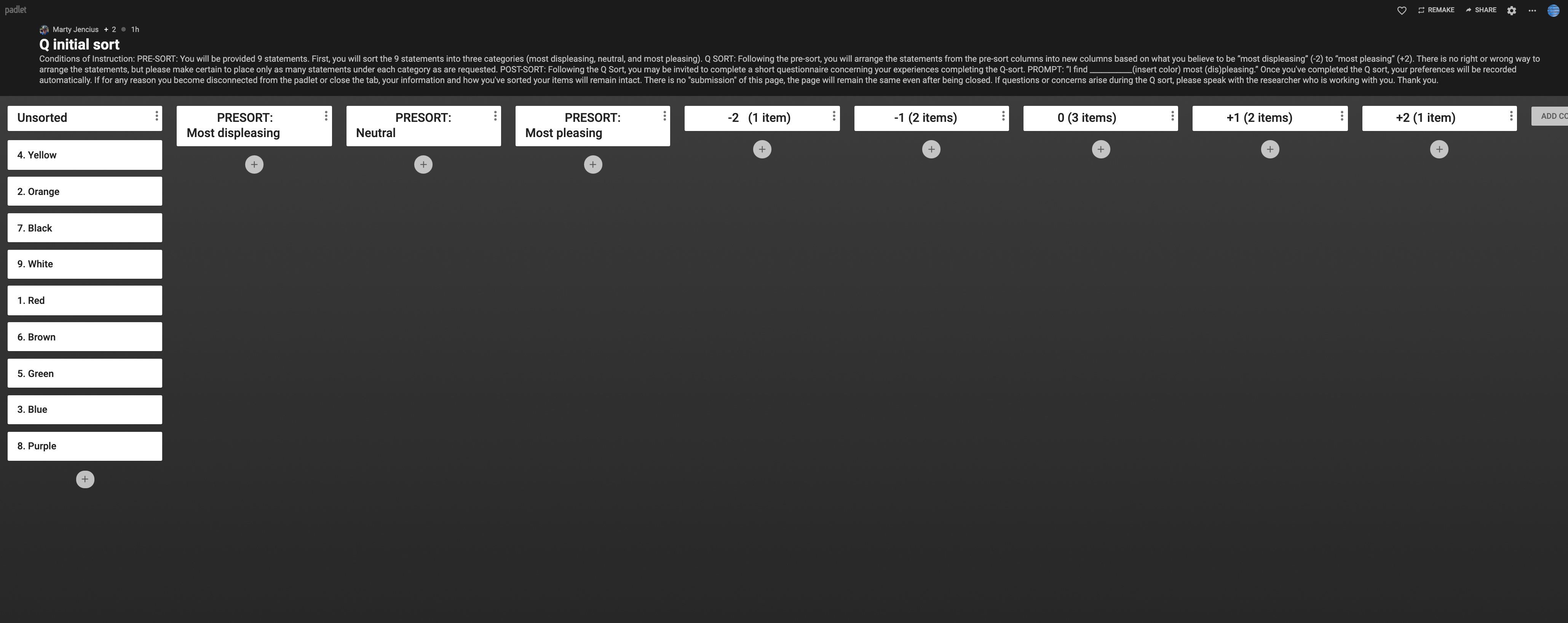 We are using www.Padlet.com as a platform for sorting produced q-set elements as cards in the online app. The sort can be done asynchronously by giving subjects the link and a reusable email address to login. Padlet has a free service that you use the app The preferred method of doing the Padlet sort is synchronously using a shared screen through Microsoft Teams or Zoom. This allows the researcher to watch the sort process, ask and answer any of the questions the subject has while they are doing the sort.
