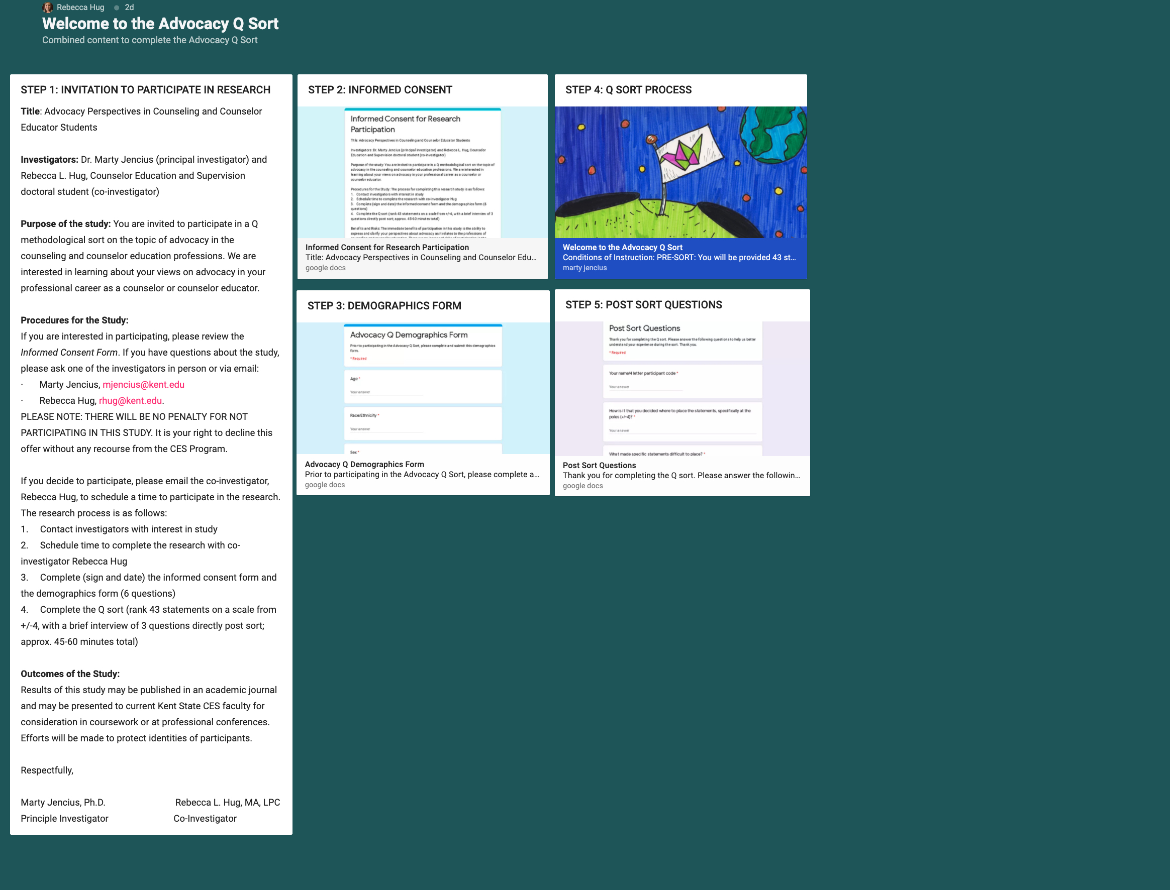 Some are created in Word and added to the Padlet (description of study), others use Google Forms (Release and post-sort questions), and some come from other Padlets you’ve created (q-sort array). These components are combined to form one Padlet display. You would use the “subject email” that you created for your study and set access to this display